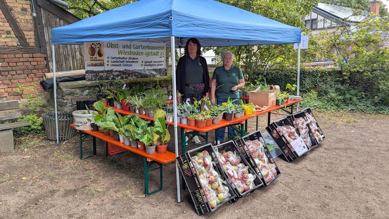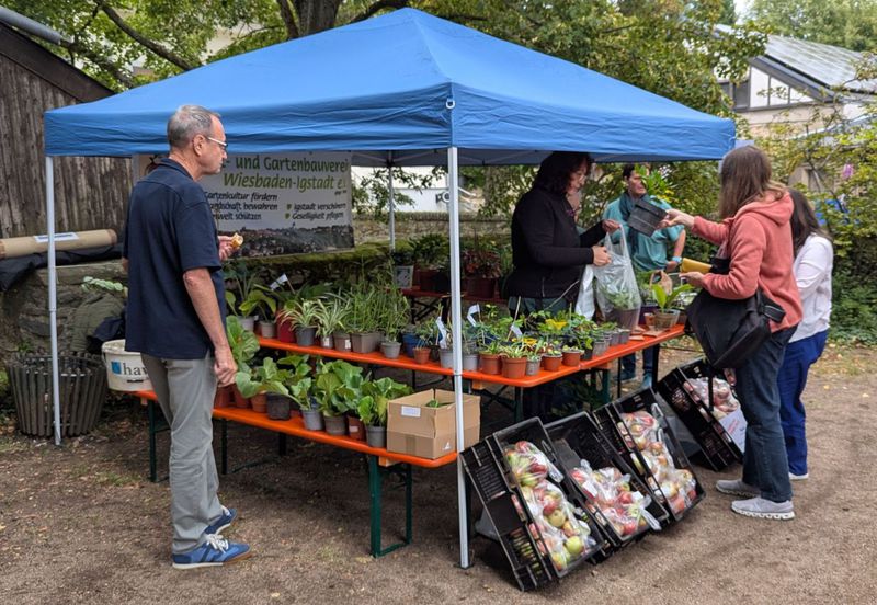 Auch dieses Jahr war der OGV wieder mit einem Stand auf dem Igstadter SuperMarkt vertreten. Angeboten wurden Pflanzen, Setzlinge und Informationen über den Verein. Der Hof Birkenhöhe in Nordenstadt hatte freundlicherweise sechs Steigen Äpfel gespendet, die reißenden Absatz fanden. Alle Einanhmen des Tages gehen als Spende an den Förderkreis "Lebendige Pfarrscheune" zur Erhaltung des Pfarrscheunen-Ensembles.