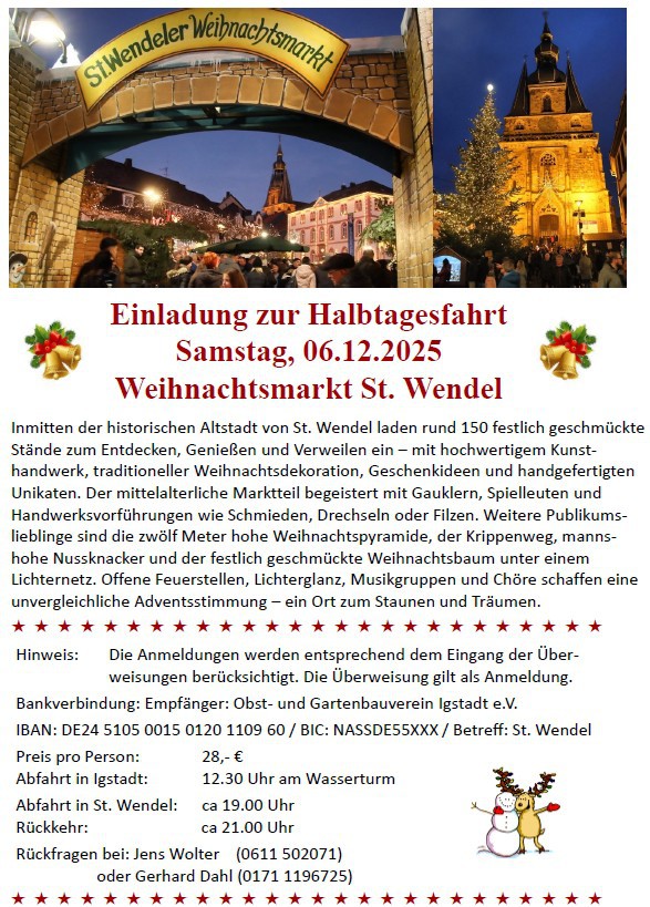 Bei leicht feuchtem Wetter aber noch angenehm herbstlichen Temperaturen konnte der Obst- und Gartenbauverein Igstadt am Samstag, dem 15.11.2024, etwa 50 Gäste auf dem stimmungsvoll beleuchteten Lindenplatz in Igstadt begrüßen. Glühwein, Kinderpunsch, Pichelsteiner Eintopf und Pizzabrötchen trugen in geselliger Runde zur Einstimmung in die Vorweihnachtszeit bei.